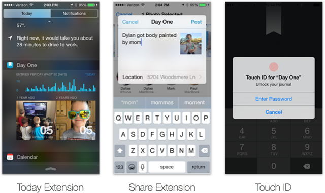 Es el turno de Day One, el mejor diario para tu iPhone o iPad. La aplicación acaba de actualizarse con soporte para iOS 8 añadiendo un widget en la pantalla de inicio para escribir en cualquier momento del día. Muy práctica de usar y con una interfaz amigable.